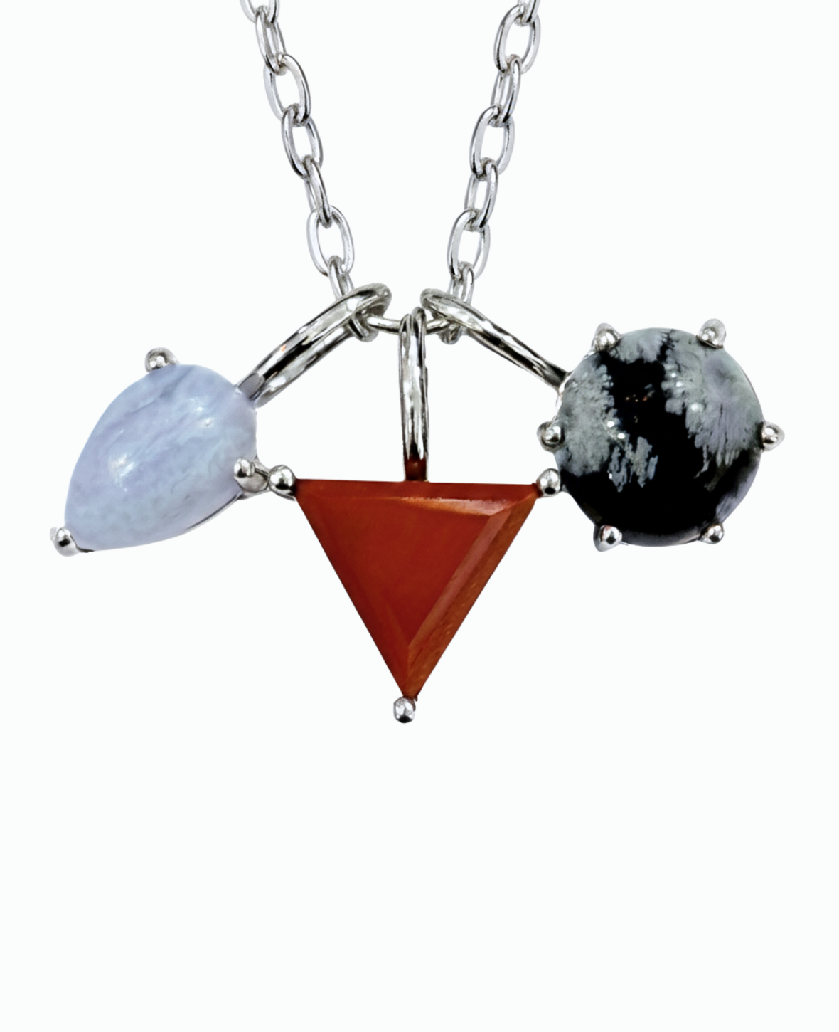 Collar de plata de ley con tres piedras naturales en cortes de lágrima, triángulo y círculo.