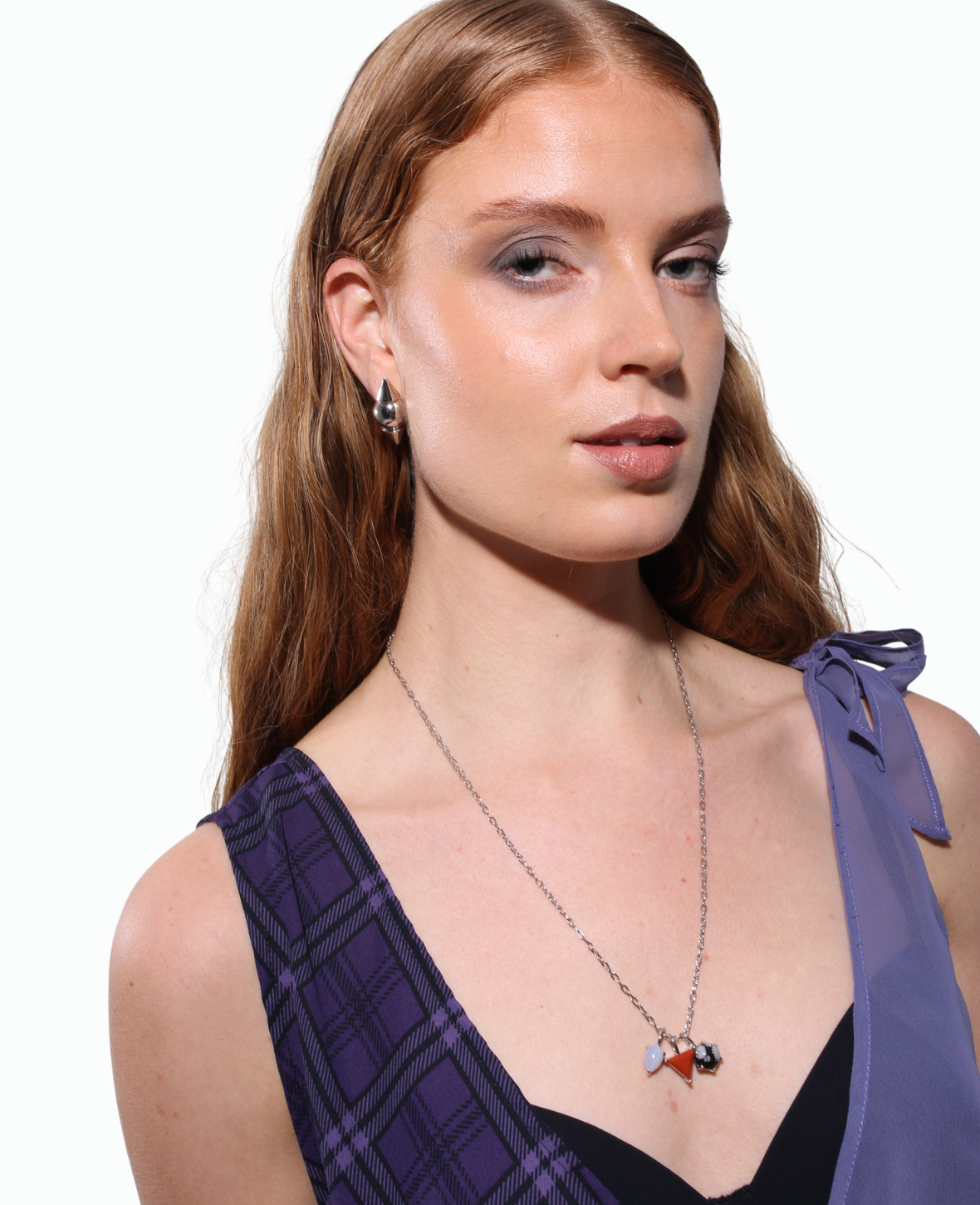 El collar LOOK 96 equilibra fuerza y serenidad en una composición de geometrías puras. Forjado en plata de ley 925, combina tres piedras naturales suspendidas en una fina cadena de plata. La Blue Lace Agate, en forma de lágrima, aporta calma y claridad con su azul suave y vetas blancas. La Red Jasper, en triángulo, irradia energía y dualidad, símbolo de impulso y contraste. La Snowflake Obsidian, en forma circular, fusiona lo salvaje y lo sofisticado en un equilibrio hipnótico. Una pieza que transforma la materia en símbolo.